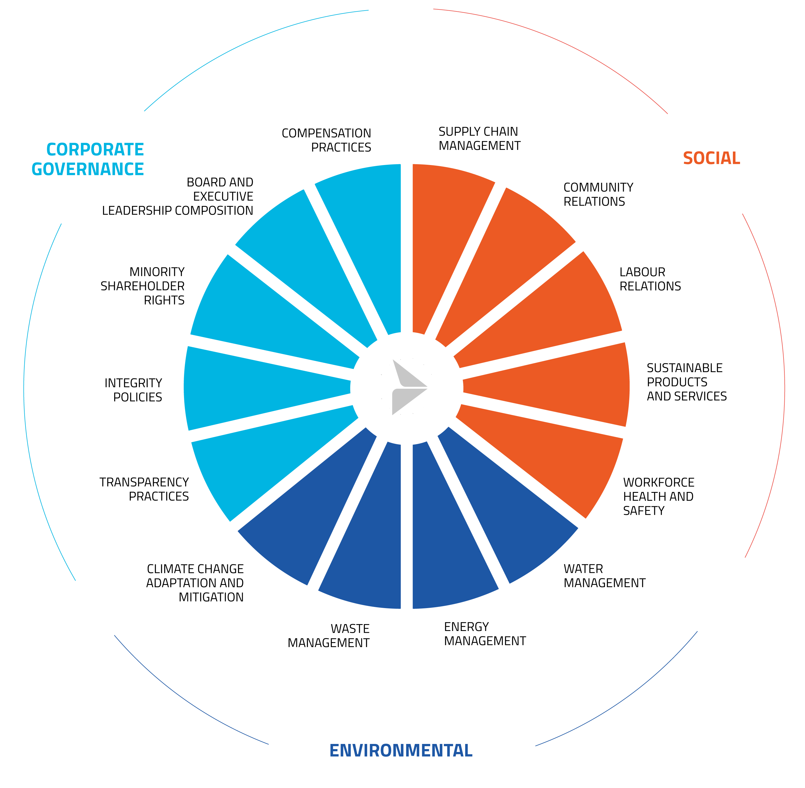 Our approach involves the assessment of 14 prioritized ESG themes within our rating model, as outlined below. The weighting of each score varies based on the industry and asset class under evaluation. This evaluation encompasses the examination of company or asset practices, policies, goals, results, and the presence of any controversies.